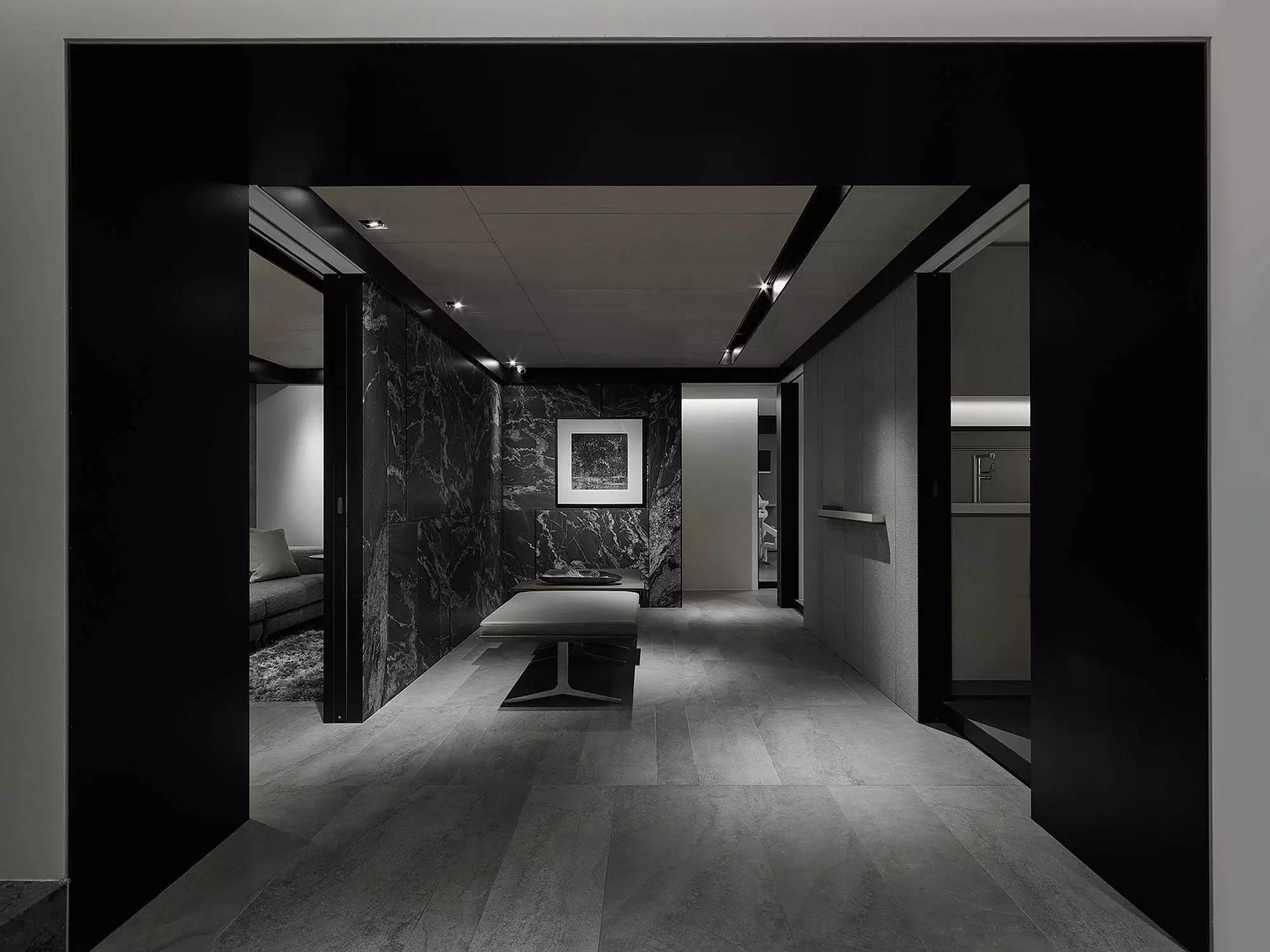將玄關(guān)刻意退縮于室內(nèi)、入口大門轉(zhuǎn)向,而產(chǎn)生一進一景之空間體驗層次,寬闊的騎樓面積與門口的虛空間,未踏入空間卻已感受沈穩(wěn)安定。
