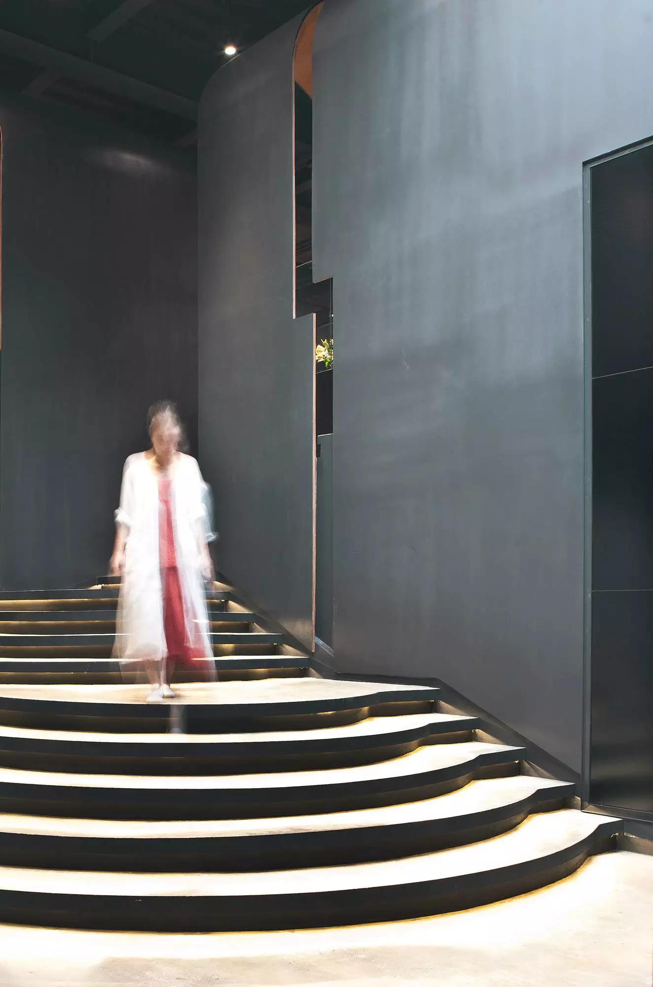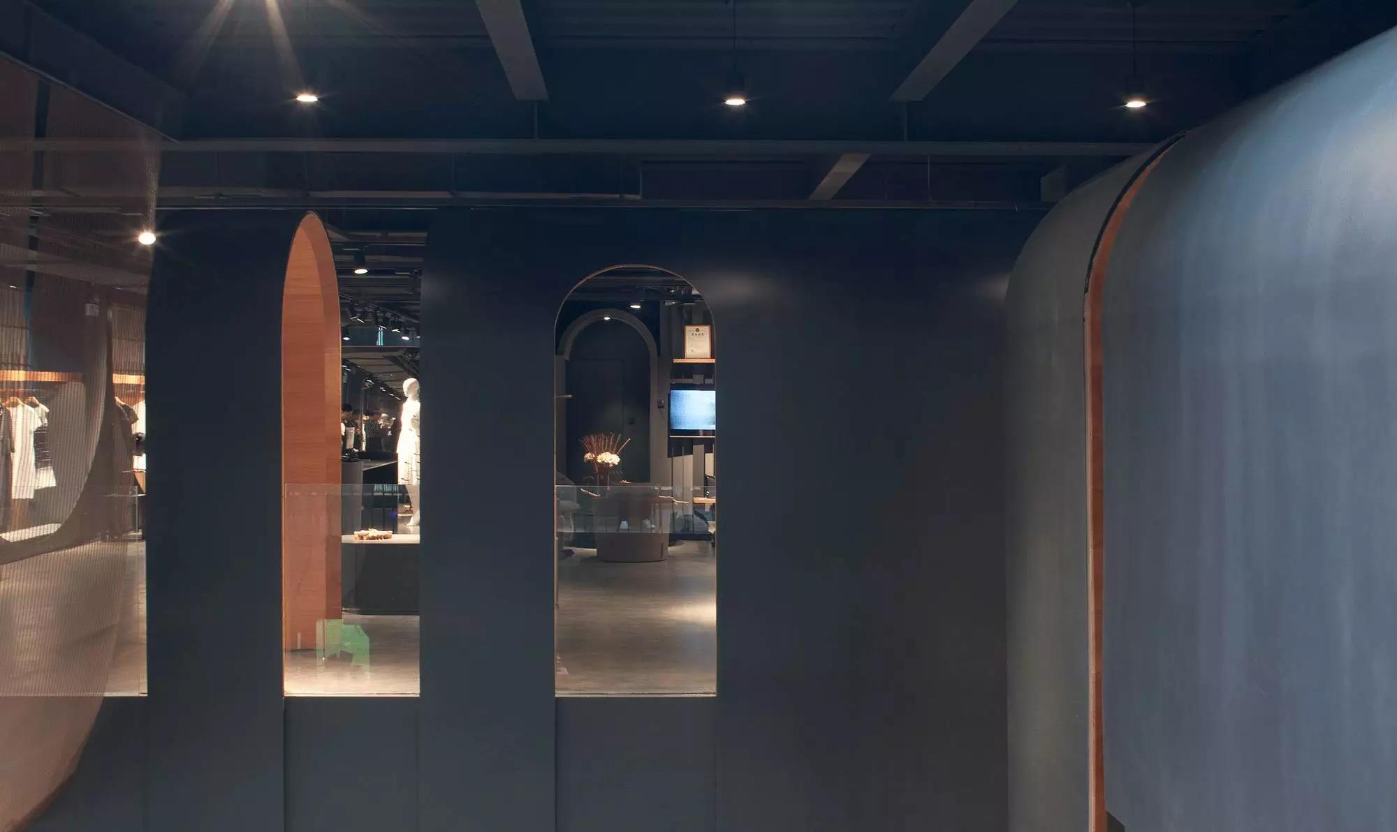 內(nèi)部空間希望呈現(xiàn)一種原始野性的魅力,采用鋼制的表皮帶來一種現(xiàn)實(shí)感。這種“直白”式的架構(gòu)材料,空間所形成的直接性與樸素性,加上大尺度的鋼板落地產(chǎn)生的力量感或輕盈感,使整個(gè)空間與原有場(chǎng)地建筑取得一種時(shí)間與空間的接續(xù)關(guān)系。利用“拱”多變的空間特性,產(chǎn)生不同的空間,打破了均質(zhì)的體驗(yàn)。這是一個(gè)回憶的過程,再一次將建筑的體量與空間對(duì)話,越是簡(jiǎn)單的形體邏輯,越能給人帶來深刻的印象,弧拱曲線柔和,呈現(xiàn)不同角度的美感?;」暗倪B續(xù)曲線把空間構(gòu)造成圍合區(qū)域,在這樣的方式下,內(nèi)部和外部保持著空間的連續(xù)性,這個(gè)理念使空間不拘泥于常規(guī),探索傳統(tǒng)類型空間的新秩序,"拱"在傳統(tǒng)建筑中扮演重要角色,并且在漫長(zhǎng)的歷史中不斷豐富。我們?cè)噲D轉(zhuǎn)化傳統(tǒng)"拱",讓"拱"在均質(zhì)呆板的現(xiàn)代空間上制造新的突破,獲得自然能量并把它轉(zhuǎn)化為空間秩序。濃烈的空間美感,顯示該品牌的重要意義。弧拱同空間一、二層相連,創(chuàng)建出有趣的空間狀態(tài),吸引顧客的好奇心。